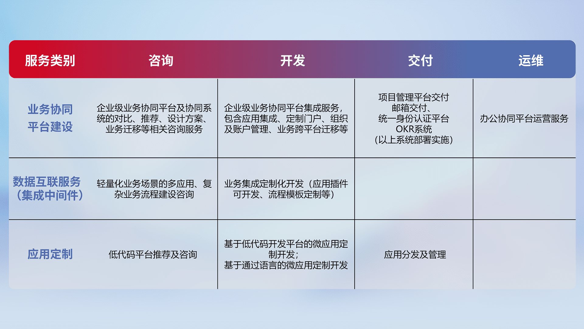 针对钉钉、、、企微、、、IDaas等平台级产品提供产品的规划、、、、方案、、交付、、、、定制化开发等服务,,,实现如统一协同办公、、、、智能客户服务、、、混合会议管理、、、智能数据查询、、、等业务场景,,,实现数字化转型。。